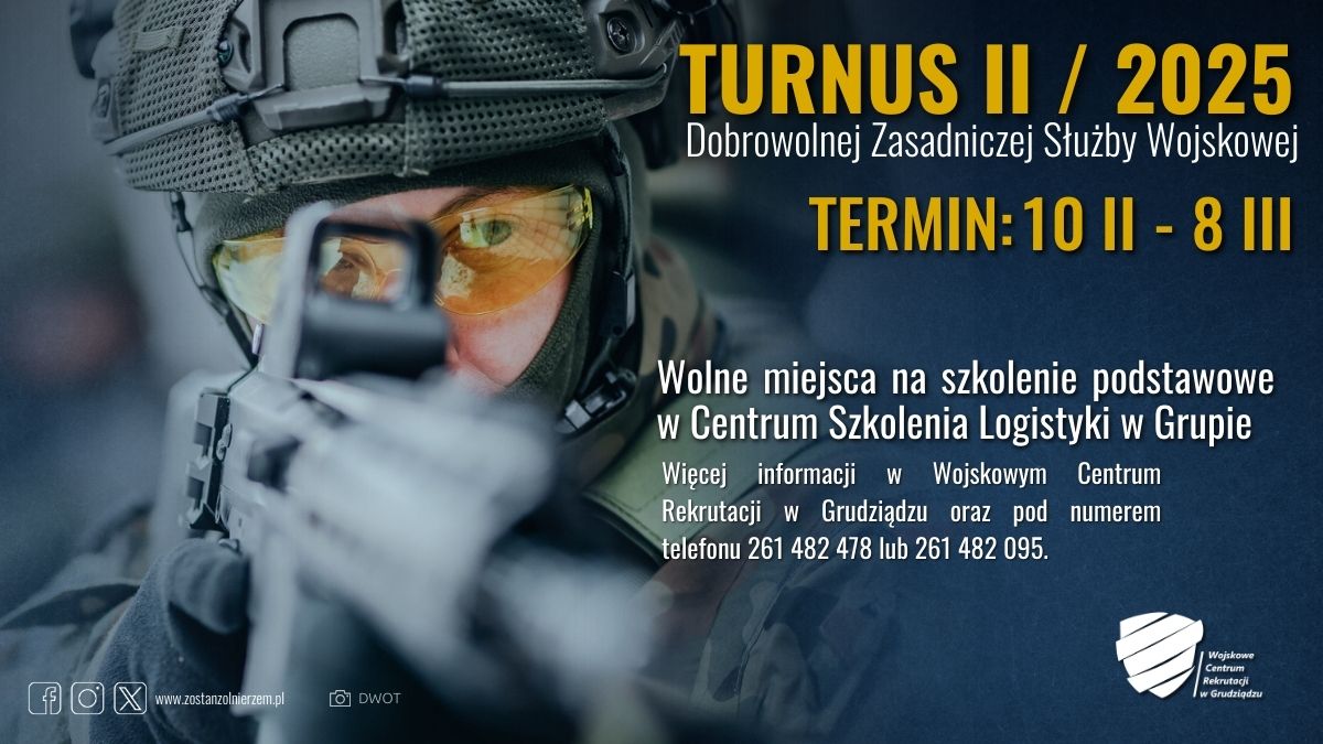 II TURNUS DZSW 2025 ROKU! TERMIN: 10.02 - 08.03 Wolne miejsca na szkolenie podstawowe w Centrum Szkolenia Logistyki w Grupie! Więcej informacji w Wojskowym Centrum Rekrutacji w Grudziądzu oraz pod numerem telefonu 261 482 478 lub 261 482 095. www.zostanzolnierzem.pl