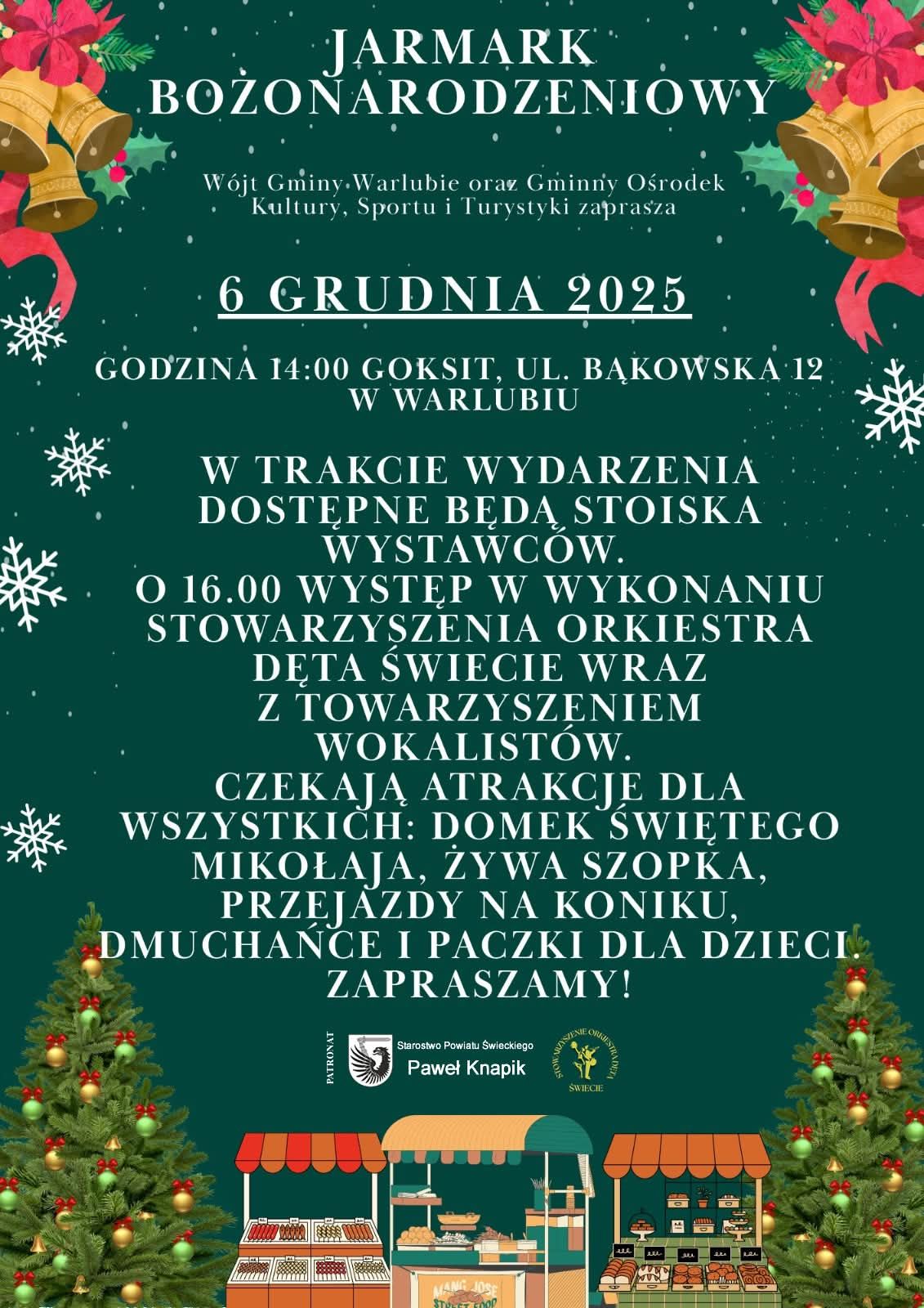 Serdecznie zapraszamy na Jarmark Bożonarodzeniowy, który odbędzie się 6 grudnia 2025 roku w GOKSiT przy ul. Bąkowskiej 12 w Warlubiu.