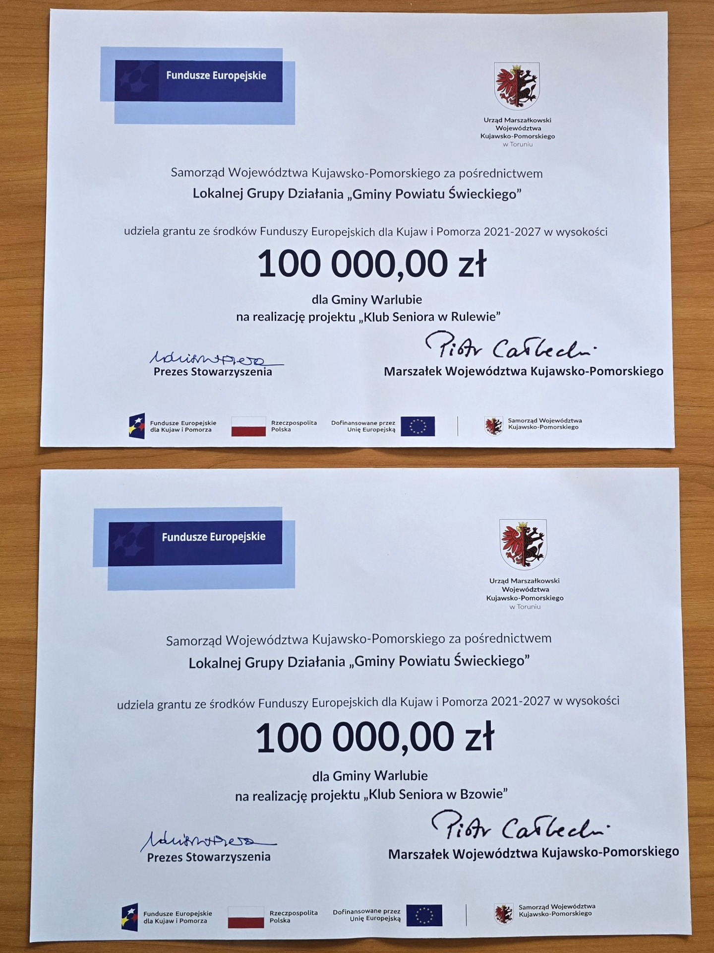 Gmina Warlubie otrzymała od Samorządu Województwa Kujawsko-Pomorskiego, za pośrednictwem Lokalnej Grupy Działania „Gminy Powiatu Świeckiego”, dwa granty o łącznej wysokości 200 000,00 zł na realizację projektów „Klub Seniora w Rulewie” oraz „Klub Seniora w Bzowie”.