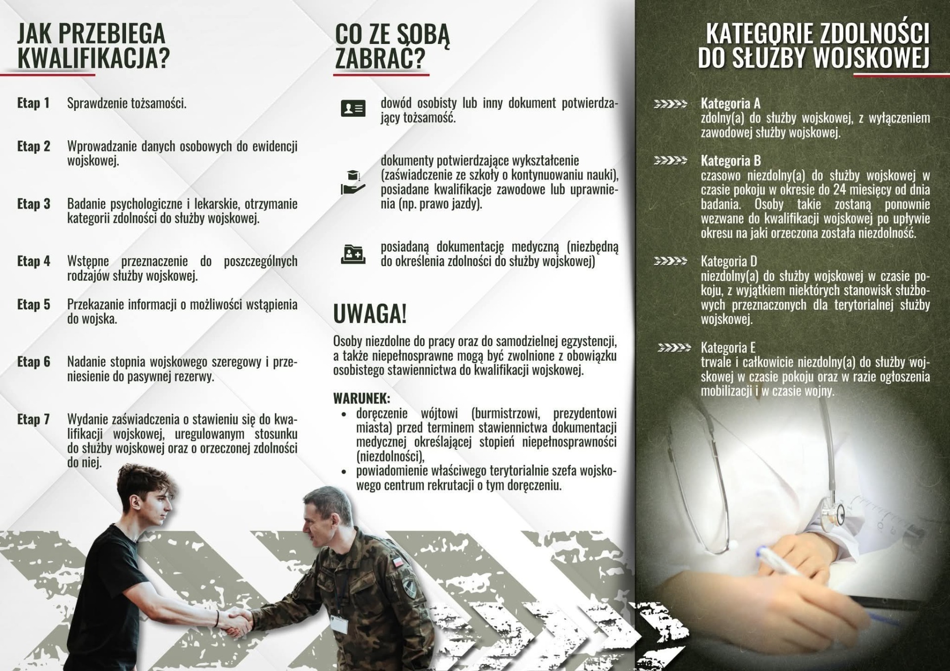 Kwalifikacja wojskowa to także doskonały moment, aby dowiedzieć się, jakie możliwości daje dzisiejsze Wojsko Polskie. Każdy, kto odwiedzi powiatową komisję, lekarską może porozmawiać z przedstawicielem Wojskowego Centrum Rekrutacji o Dobrowolnej Zasadniczej Służbie Wojskowej, Terytorialnej Służbie Wojskowej, czy o uczelniach wojskowych i szkołach podoficerskich oraz spotkać się z żołnierzami z jednostek wojskowych, którzy będą prezentować specyfikę służby wojskowej w swojej macierzystej jednostce wojskowej wraz z indywidualnym wyposażeniem żołnierskim.