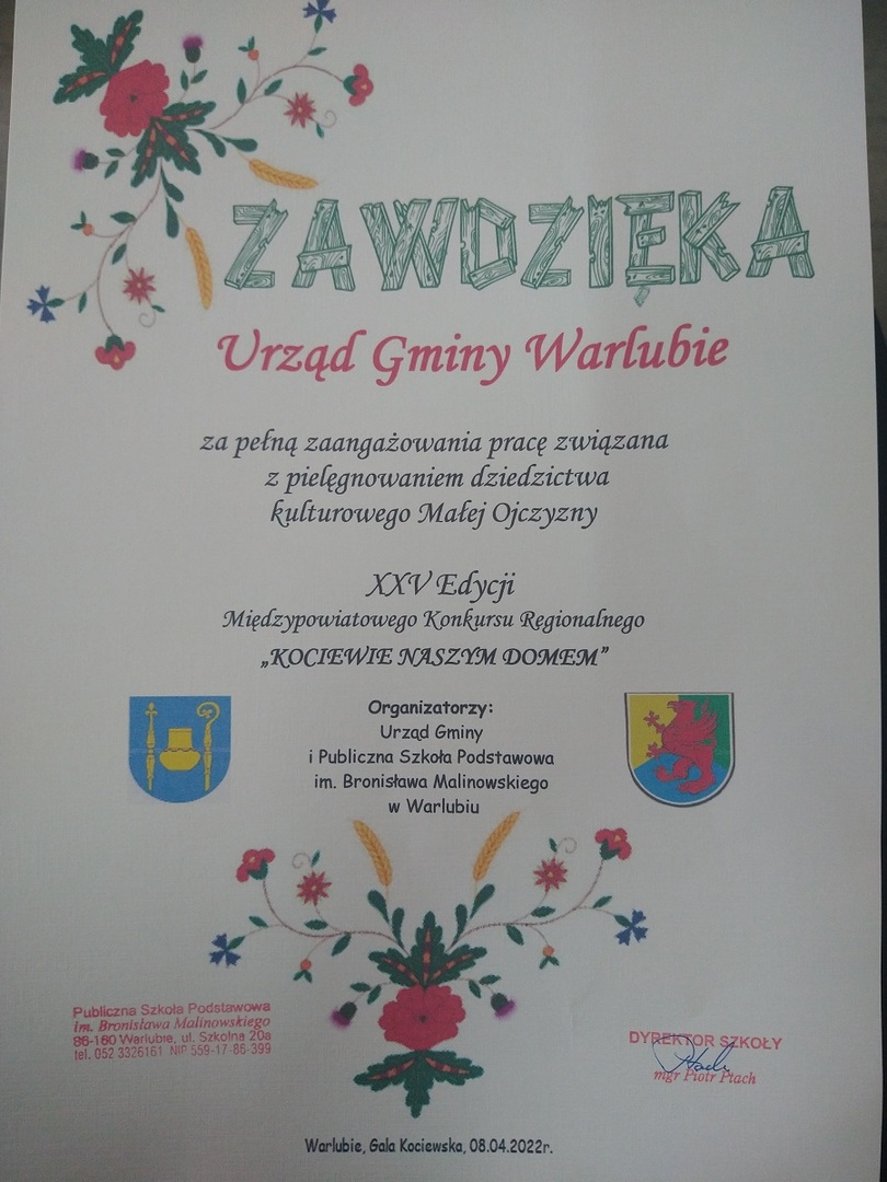 Organizatorkom Pani Żanecie Jaworskiej oraz Pani Joannie Fordońskiej-Jędral serdecznie dziękujemy za promowanie tak pięknego i barwnego regionu, jakim jest Kociewie, a przy tej okazji również naszej Gminy.