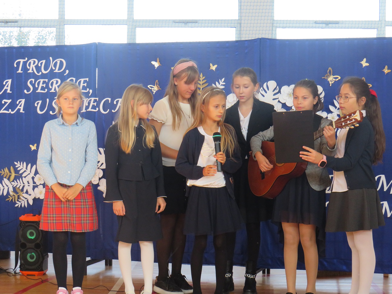 Nie zabrakło pięknych wierszy, jak też dowcipnych skeczy na temat trudnej pracy nauczyciela. Wszystko okrasiły piosenki, do których akompaniament na gitarze przygotowała jedna z uczennic tej klasy. Część artystyczną zakończyło gromkie „Sto lat” w wykonaniu wszystkich uczniów szkoły oraz słodkie upominki wręczone nauczycielom przez klasę 4.