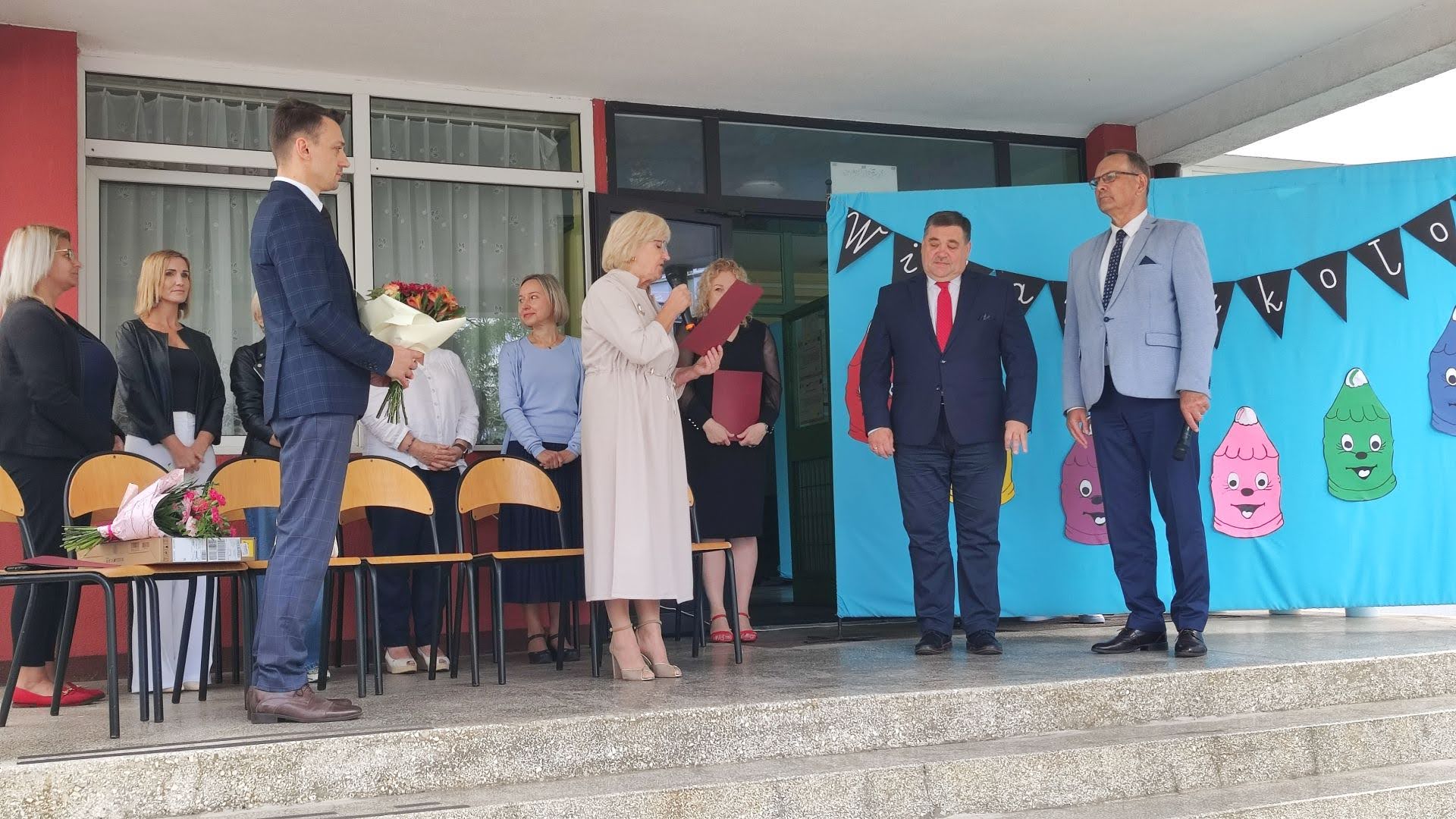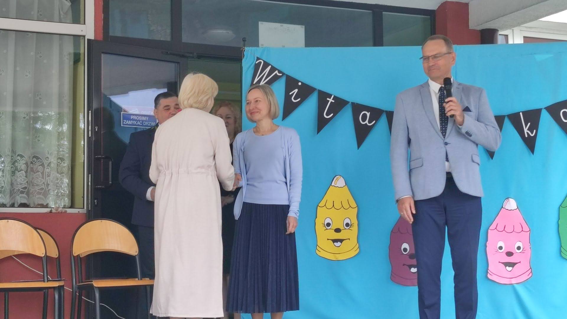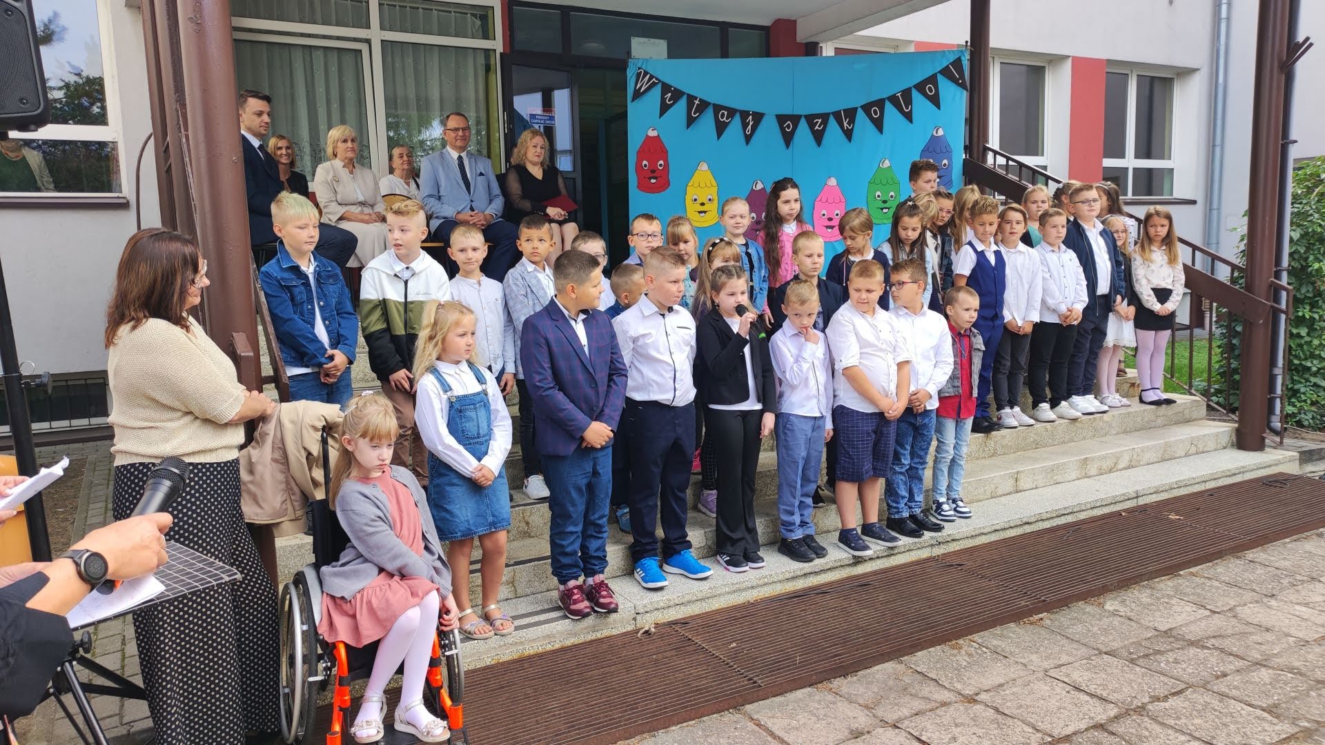 Wyjątkowo, bo w poniedziałek 4 września 2023 r., Społeczność Publicznej Szkoły Podstawowej im. Bronisława Malinowskiego w Warlubiu zebrała się przed budynkiem swojej Szkoły, aby uroczyście rozpocząć rok szkolny 2023/2024. Uroczystość zaczęła Przewodnicząca Samorządu Szkolnego, która poprosiła Wójta Gminy Warlubie o wystąpienie. Tuż po nim, Wójt podziękował za minione lata współpracy na stanowisku Dyrektora Placówki Panu Piotrowi Ptachowi, a następnie powitał oficjalnie na stanowisku nową Dyrektor - Panią Karinę Kozłowską - Kamińską, która objęła funkcję w dn. 01.09.2023 r. Wicedyrektorką Szkoły została Pani Aneta Piotrowska. W trakcie uroczystości, pożegnano również odchodzące na emeryturę pracownice Szkoły: Panią Elżbietę Grzonę i Panią Bożenę Chyła.
