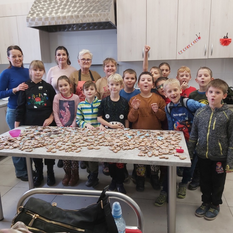 Następnie zorganizowano Wigilię dla starszych i samotnych mieszkańców, z udziałem przedstawicieli władz samorządowych oraz specjalnych gości z DPS Gołuszyce. W organizacji imprezy Szkołę wsparły Panie z Rady Sołeckiej, a KGW pomogło dzieciom upiec pierniczki, stanowiące świąteczne upominki dla gości. Obdarowano też podopiecznych z DPS prezentami uzyskanymi ze zbiórki przeprowadzonej wśród Rodziców i pracowników szkoły.